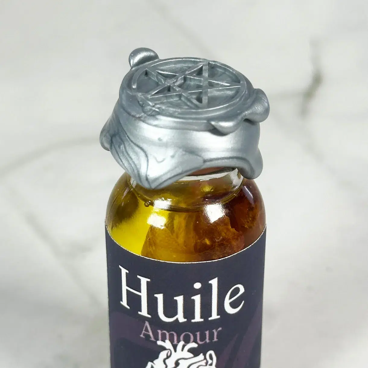 Chaque flacon est soigneusement scellĂ© Ă la cire ornĂ©e dâun pentacle, symbole de protection et de maĂźtrise Ă©nergĂ©tique, et muni dâun bouchon pour une conservation optimale.